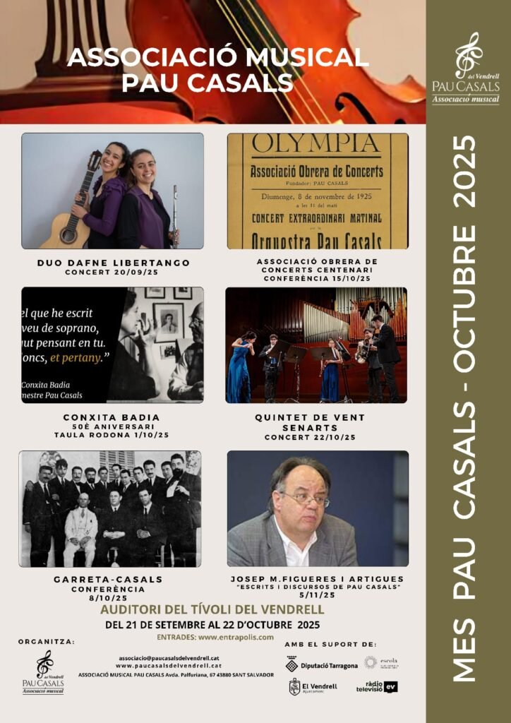 - Dimecres 22 d’octubre a les 20h. Concert del 52è aniversari de la mort de Pau Casals: a càrrec del Quintet de Vent SenArts; “Tastavents” a l’Auditori del Tívoli, amb un repertori variat i pensat per poder ensenyar les diferents facetes històriques i possibilitats tímbriques i musicals del quintet de vent.
